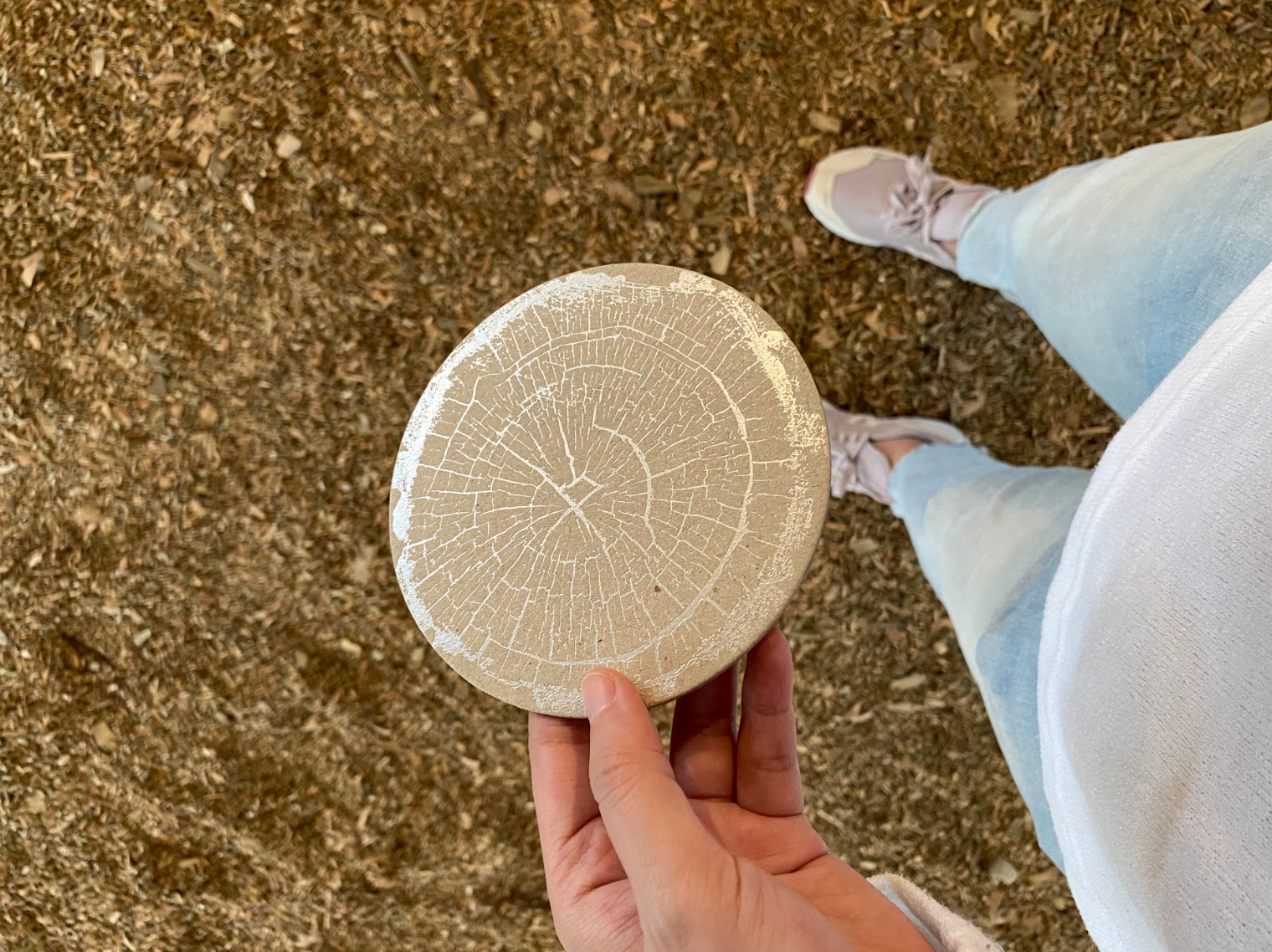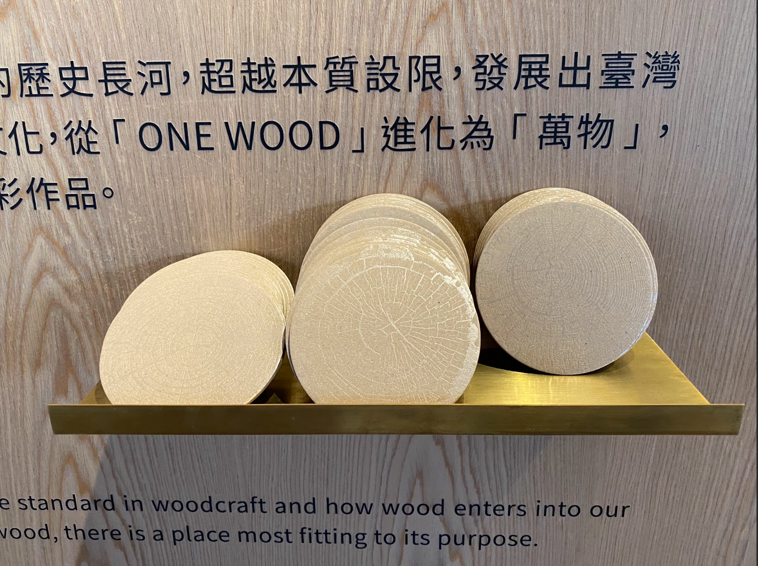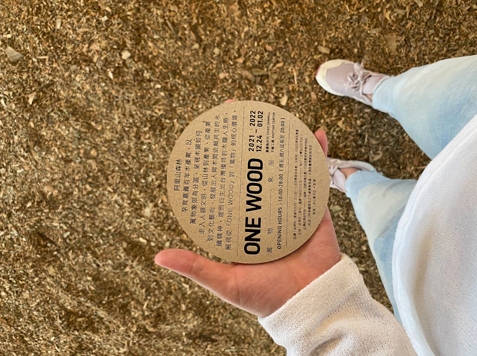 最後不得不提一下展方給大家的小禮物:木頭圓形杯墊。一面是木頭的年輪(而且每一片的年輪紋路都不一樣喔!有種客製的專屬感),另一面寫著展覽要傳遞給大家的ONE WOOD萬物精神,實在太喜歡了!
