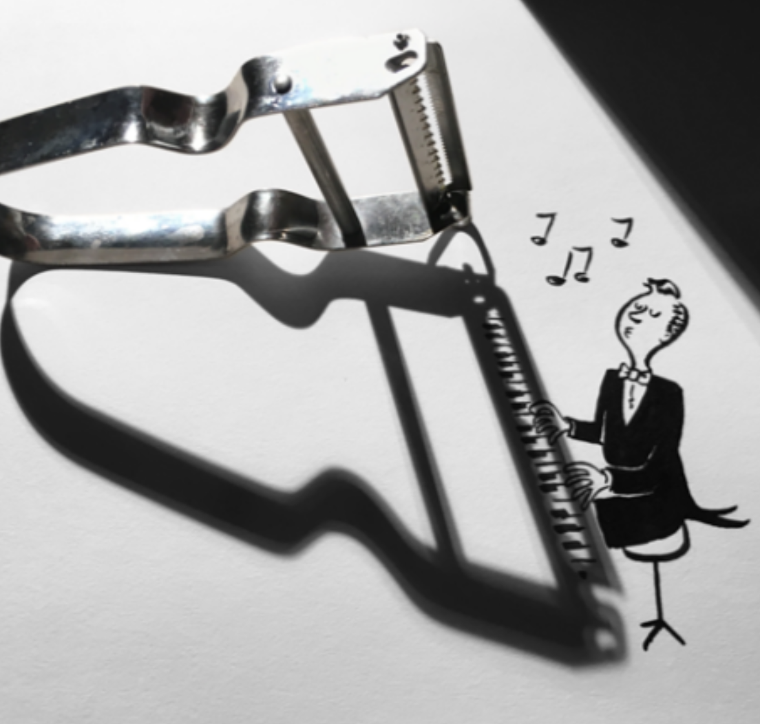 而Vincent Bal的作品或多或少大家都曾在網路瀏覽過,運用實體物件的影子,搭配畫紙上的部份繪圖,絕妙組成完整的作品,而其作品中自帶一種詼諧幽默,令人玩味。