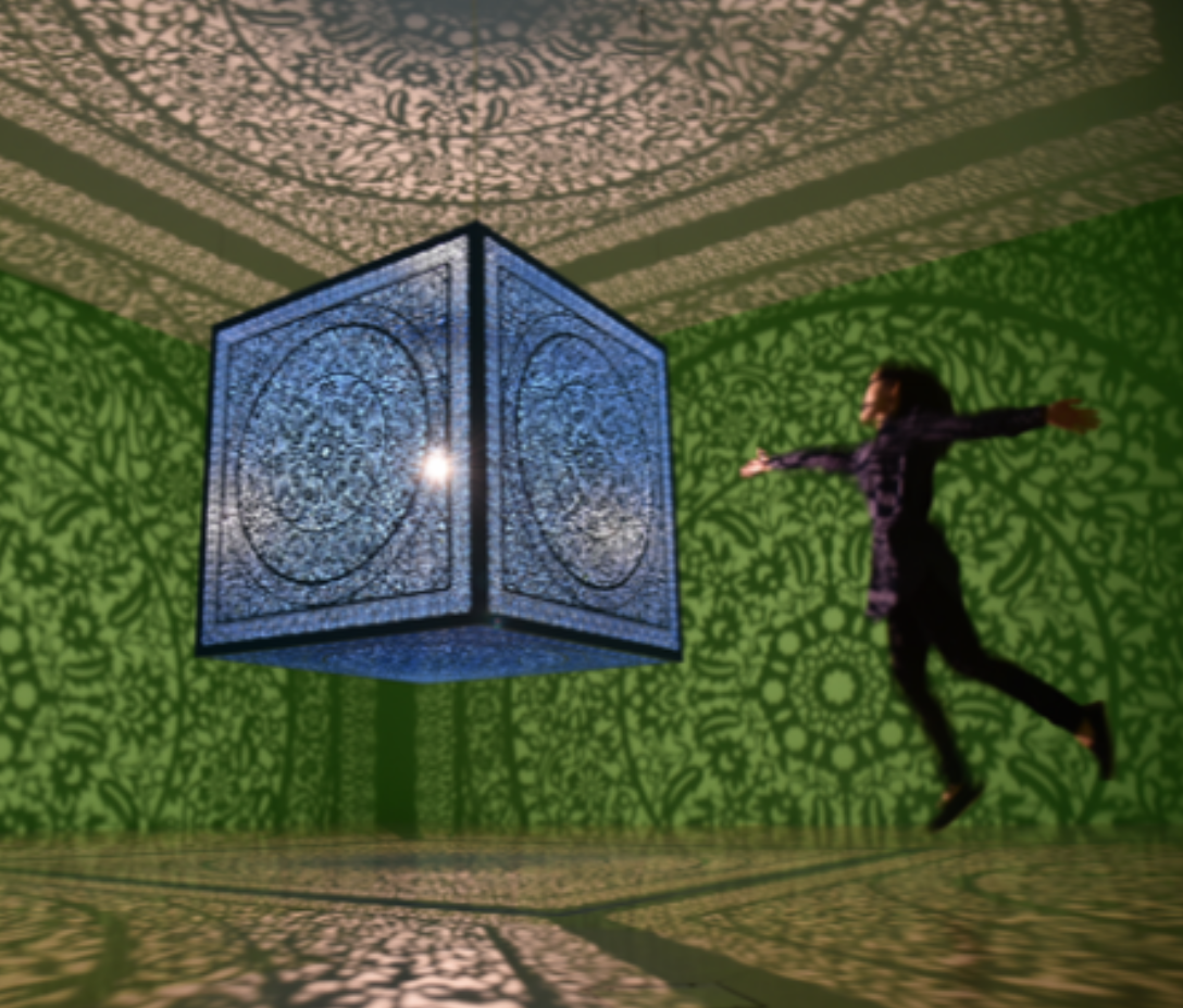 而接下來的這個巴基斯坦藝術家Anila Quayyum Agha的作品,精巧到我跟好友兩人一走進去就驚呼連連,其紋理都由藝術家自創,概念發想於植物形象,這樣的圖騰投射,背後潛藏了藝術家對於伊斯蘭文化最深的情感,仔細凝望投影而出的紋理,都能感受到滿溢的情感。而作品的名稱也很美,取名為「給自己的花─青綠色」,或許這是藝術家送給自己最美的禮物─她的家鄉、她的根源所在。