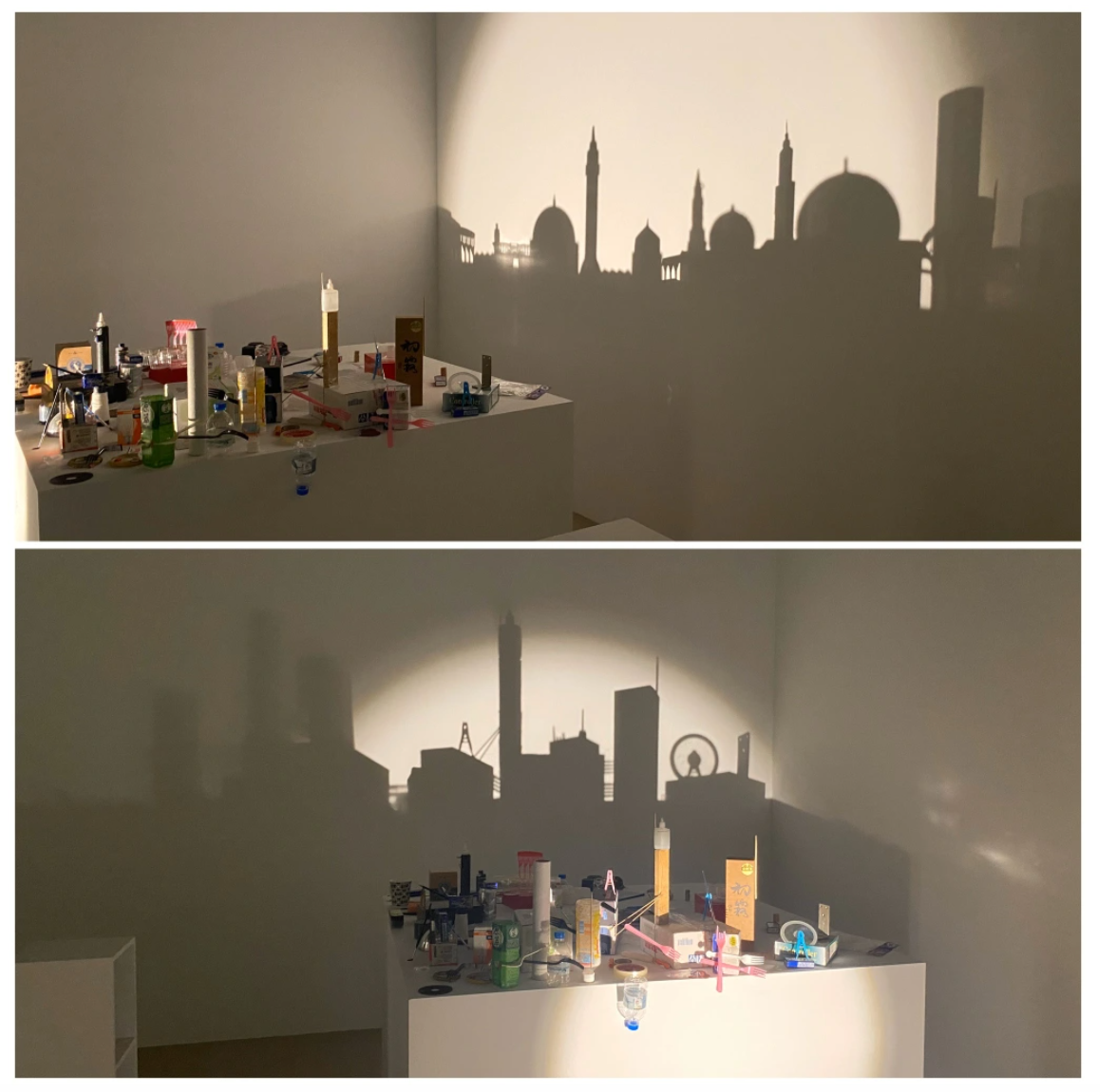 大抵作品中都藏著藝術家的核心思想吧,看著Rashad Alakbarov的作品不禁這麼想著。作品【東方西方】,運用同一素材,藉由不同角度的光源,投射出兩個世界─東方的圓頂伊斯蘭建築與西方的尖頂高樓,也像是要對世人叩問:「本質相同的事物,本該和平共處,何以套上不同視野,即成兩個世界?」
