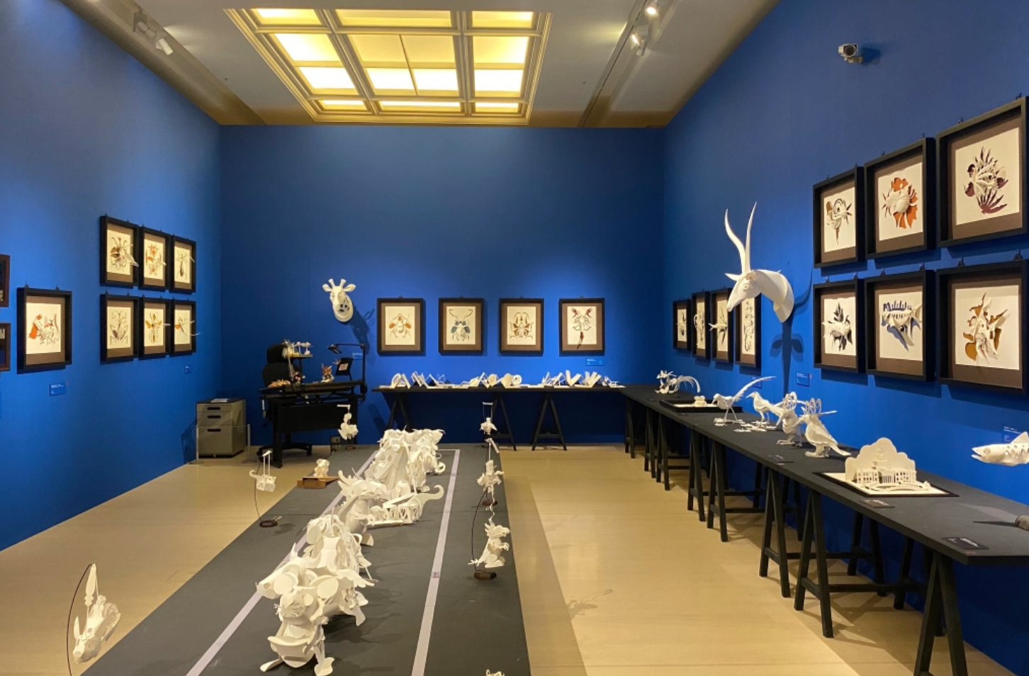 第一個迎接我們的是臺灣藝術家洪新富的紙上創造,透過裁減將一個又一個動物躍然紙上,藉由一張2D平面的紙張,轉換成3D的動物們,這一定需要強大的空間概念才有辦法做到,尤其是飛魚系列,生動地呈現了飛魚慢慢成形的過程。